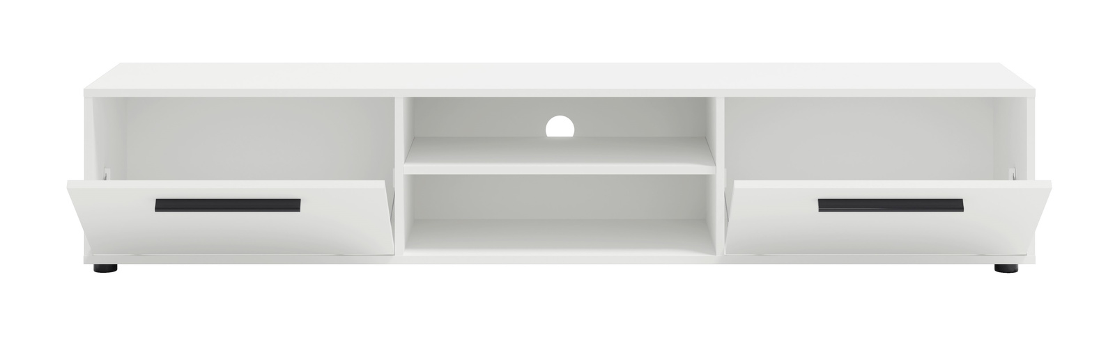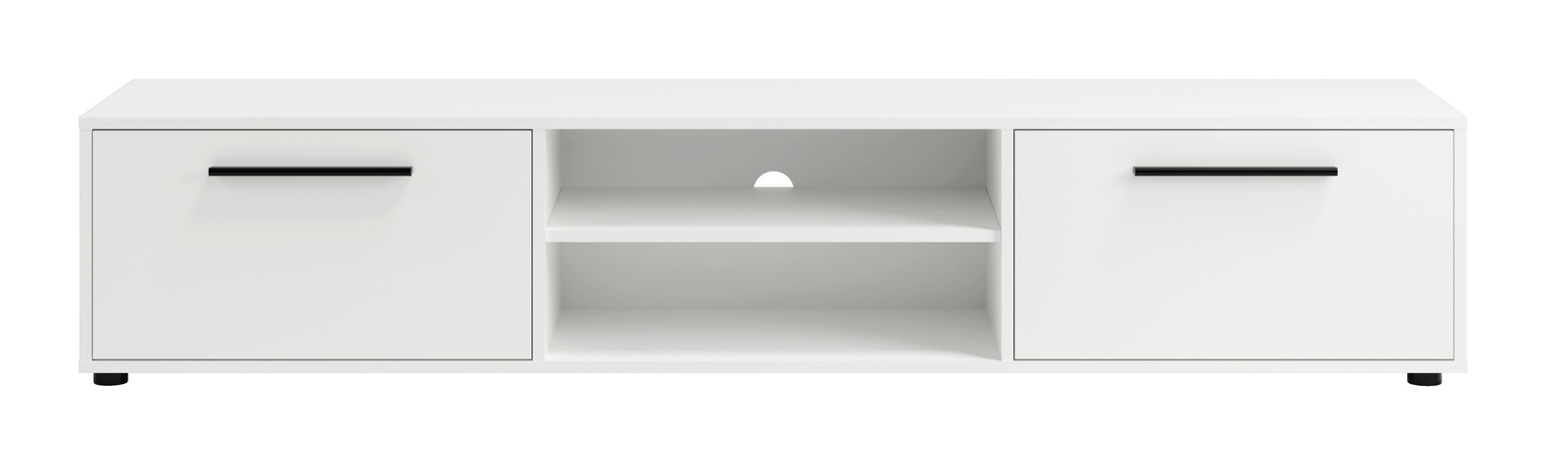Das Modell ist mit zwei verschließbaren Seitenschränken und einem offenen, in zwei Ebenen unterteilten Mittelfach ausgestattet, in dem Sie bequem Ihre Unterhaltungselektronik, Konsolen, Decoder und anderes Zubehör verstauen können. Die 190 cm lange Abstellfläche bietet problemlos Platz für einen Fernseher und Dekorationen, sodass Sie einen ästhetischen und praktischen Raum in Ihrem Wohnzimmer gewinnen.