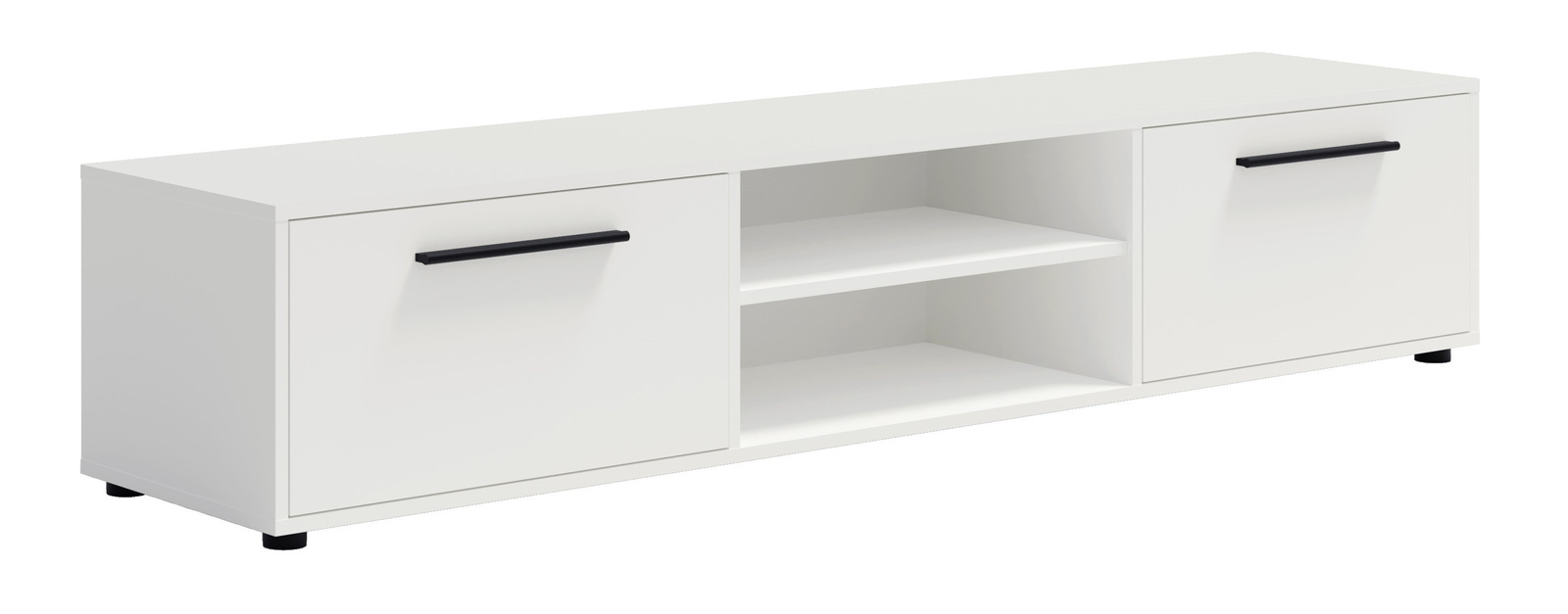 Der TV-Schrank Modena in Weiß ist eine Kombination aus modernem Design und praktischer Lösung für jedes Wohnzimmer. Seine dezente, helle Farbe verleiht dem Raum Leichtigkeit und Harmonie, während die schwarzen Griffe dem Ganzen Charakter und Eleganz verleihen und den modernen Stil des Möbels unterstreichen.