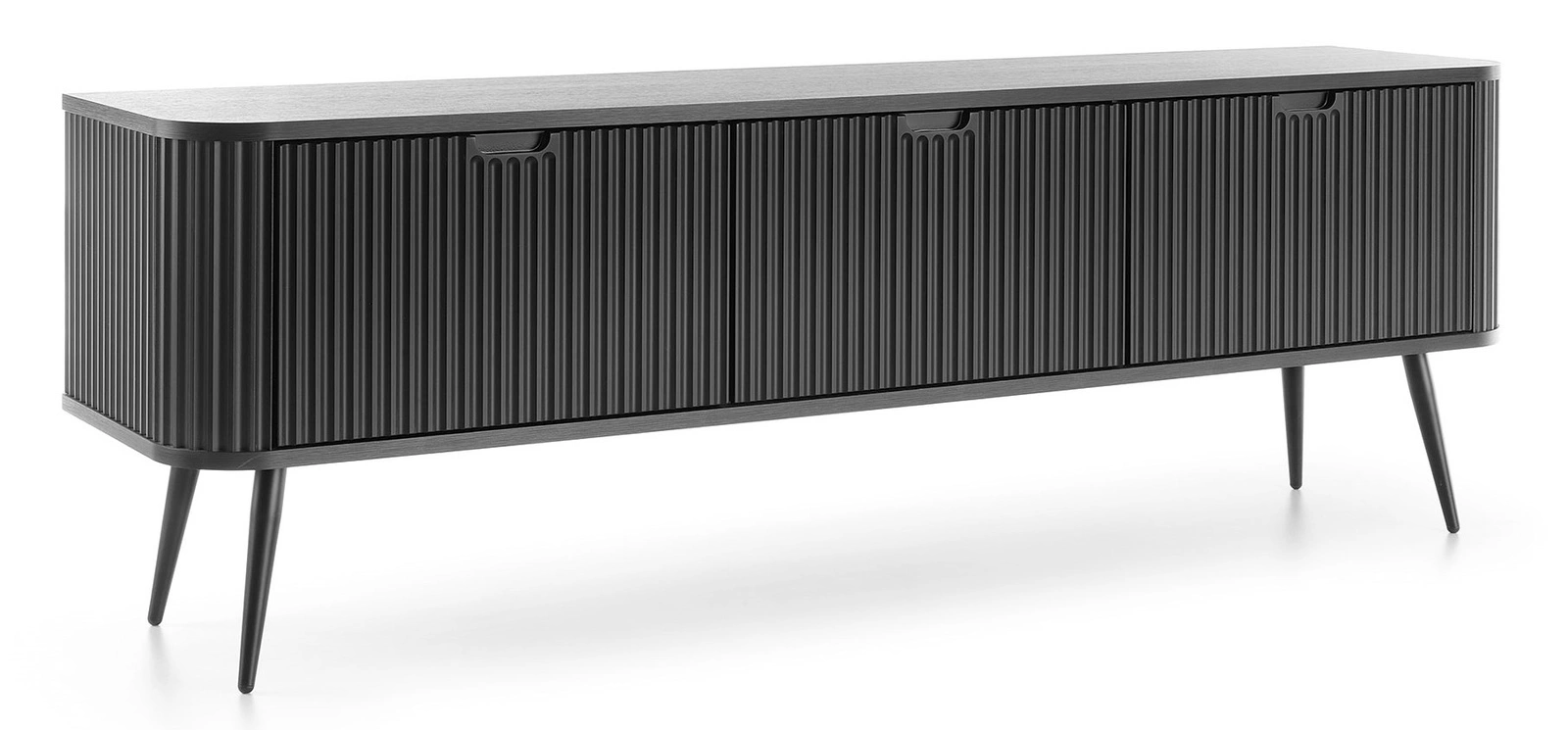 TV-Schrank Porto 168 cm in Schwarz, dreitürig, mit geriffelten Fronten und schwarzen Beinen