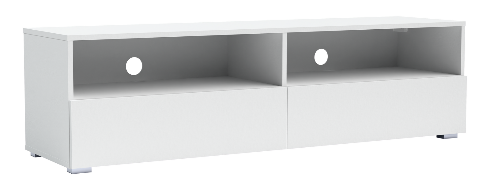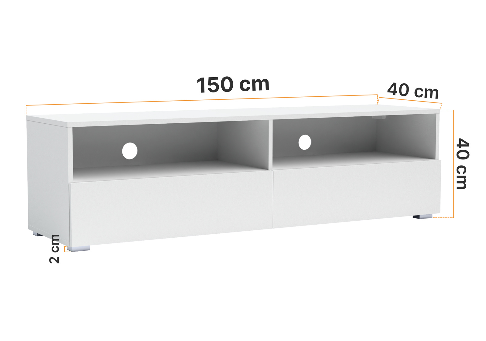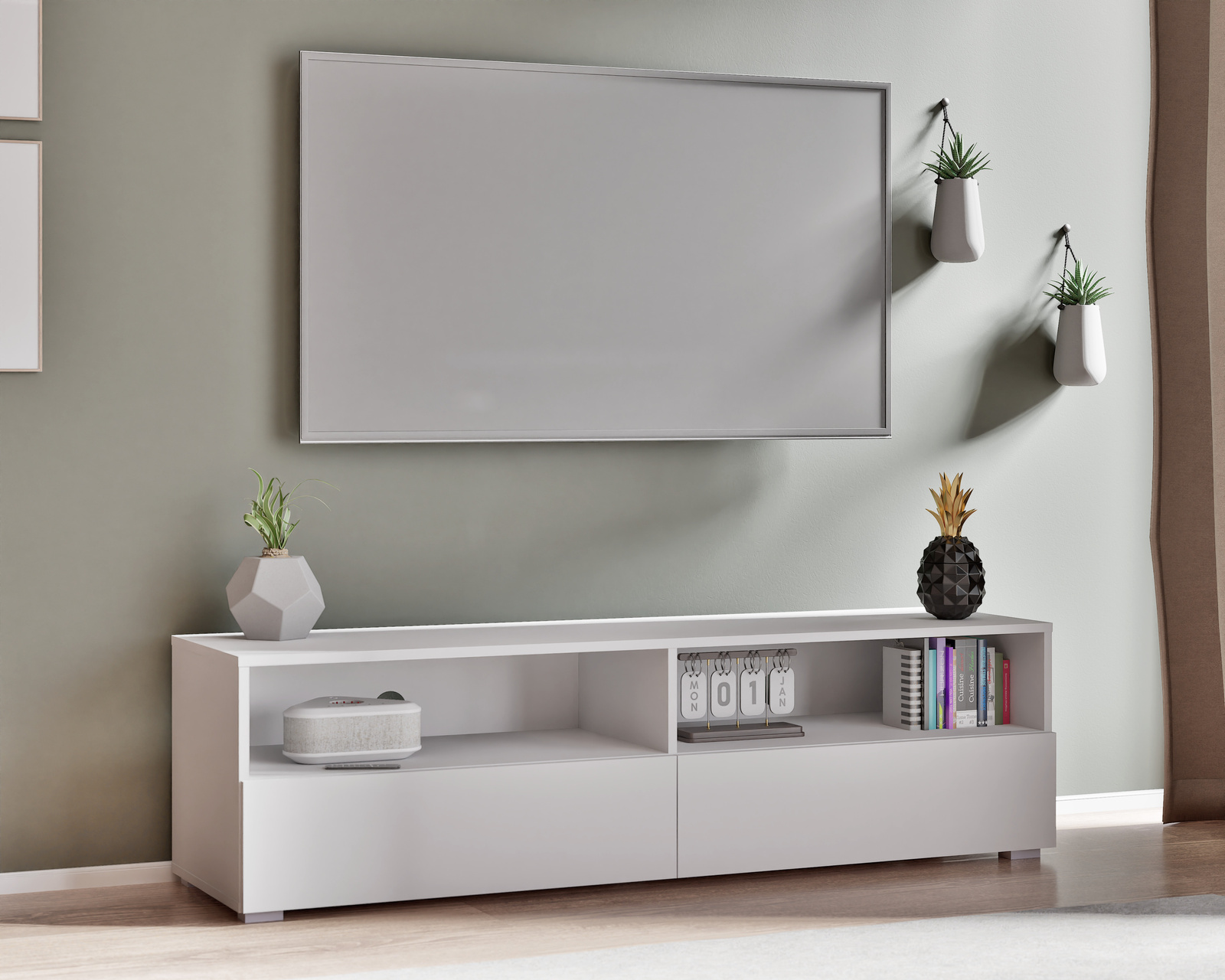 - Der TV-Schrank Tebris 150 in mattem Weiß verbindet Schlichtheit und Funktionalität. Mehr Platz für Geräte, ein modernes Design ohne Griffe und ein Push-to-Open-System machen ihn zu einer großartigen Wahl für größere, minimalistische Innenräume.