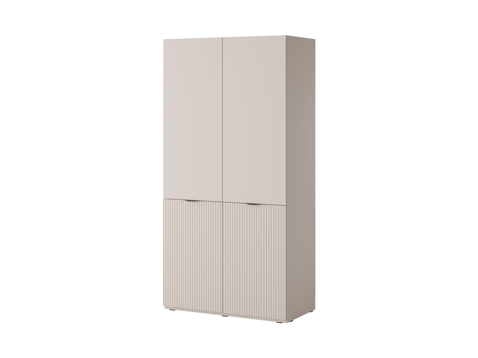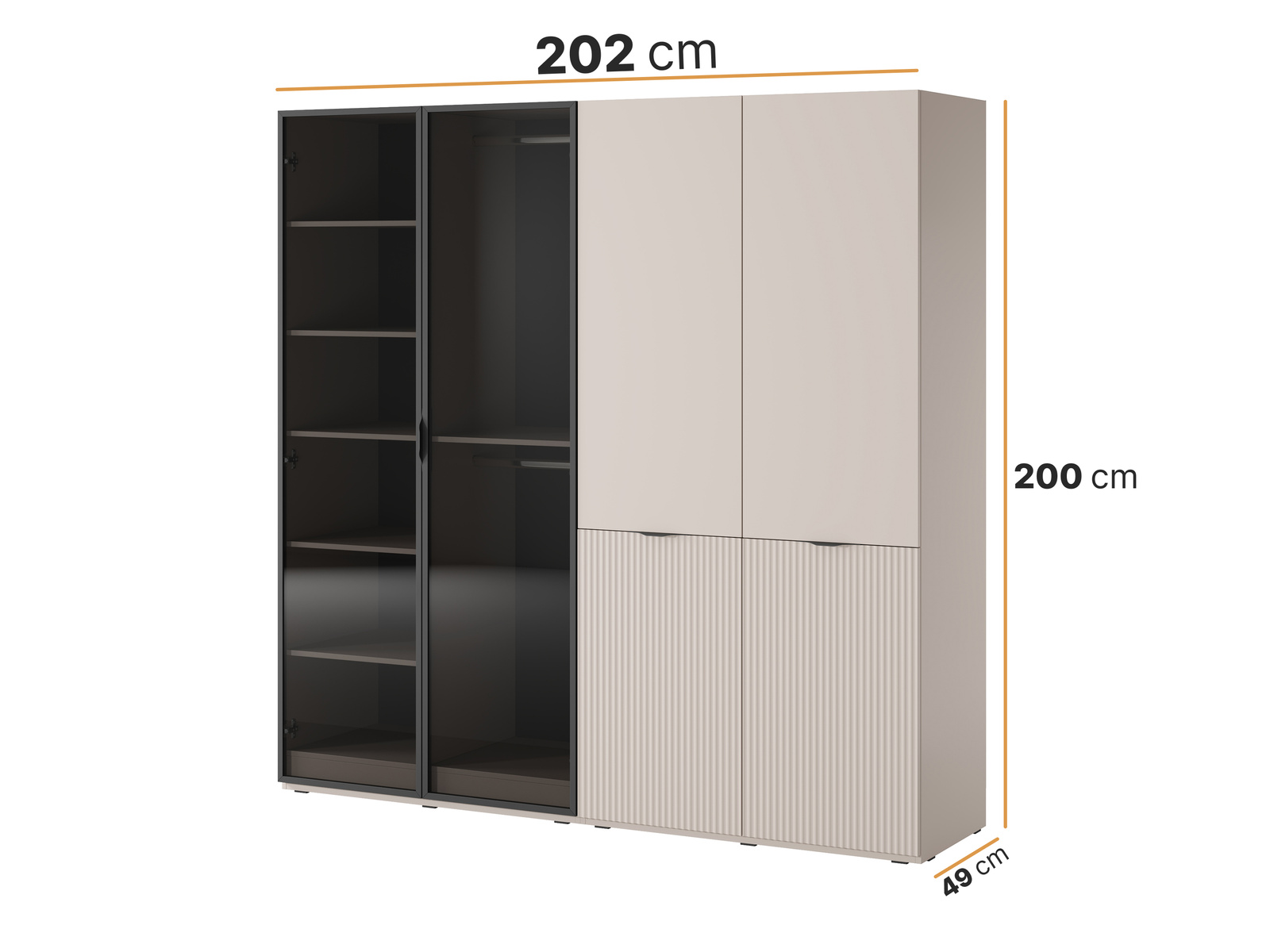 Der zweiteilige Schrank 2x104 cm ist eine moderne Komposition, die elegantes Aussehen mit praktischen Lösungen verbindet. Auf der einen Seite befinden sich Verglasungen aus rauchfarbenem Antisol-Glas, die den Inhalt dezent zur Geltung bringen. Auf der anderen Seite befinden sich kaschmirfarbene Vollfronten mit vertikaler Fräsung, die dem Möbelstück Wärme und Struktur verleihen.
