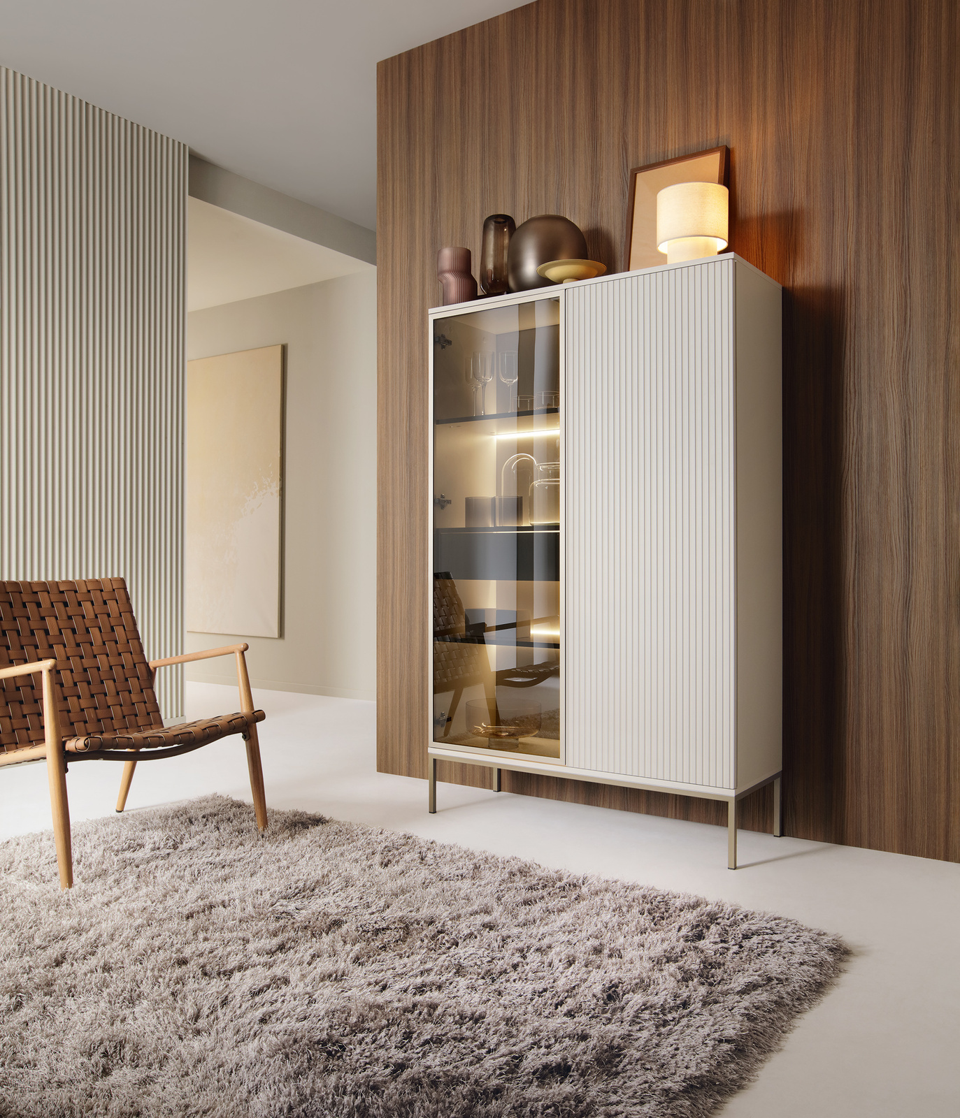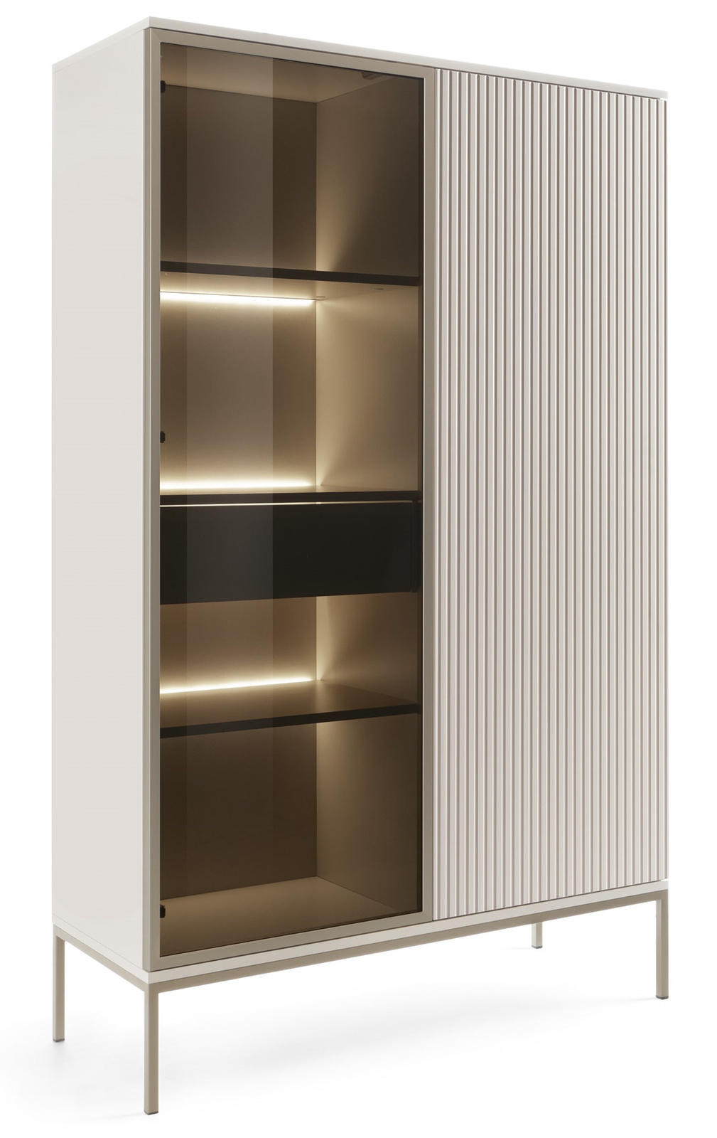 Die 166 cm hohe Vitrine in edlem Kaschmir verbindet dekorative Riffelung mit moderner Funktionalität. Der linke Teil besteht aus einer Tür aus gehärtetem Glas, hinter der sich vier Einlegeböden befinden – ideal für Glas, Porzellan oder Sammlerstücke. Der Innenraum wird durch eine dezente LED-Leiste beleuchtet, die den Inhalt hervorhebt und abends eine angenehme Atmosphäre schafft. Der rechte Bereich mit gefräster Front verbirgt vier praktische Einlegeböden. Das Ganze ruht auf schlanken Metallbeinen im Loft-Stil – optisch leicht und pflegeleicht. Die strapazierfähige Möbelplatte und die matte, kratzfeste Oberfläche machen diese Vitrine nicht nur elegant, sondern auch langlebig und praktisch.