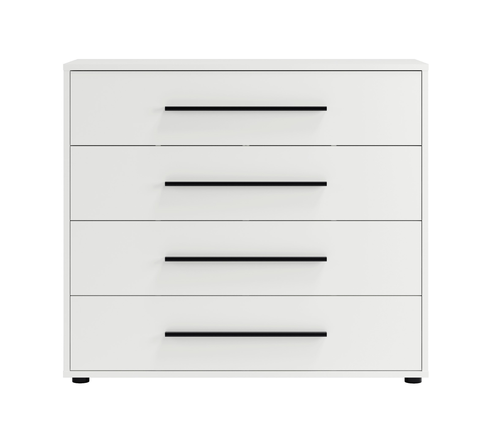- Kommode Modena in Weiß mit 4 geräumigen Schubladen. Funktional und modern – ideal für Schlafzimmer, Wohnzimmer oder Jugendzimmer.