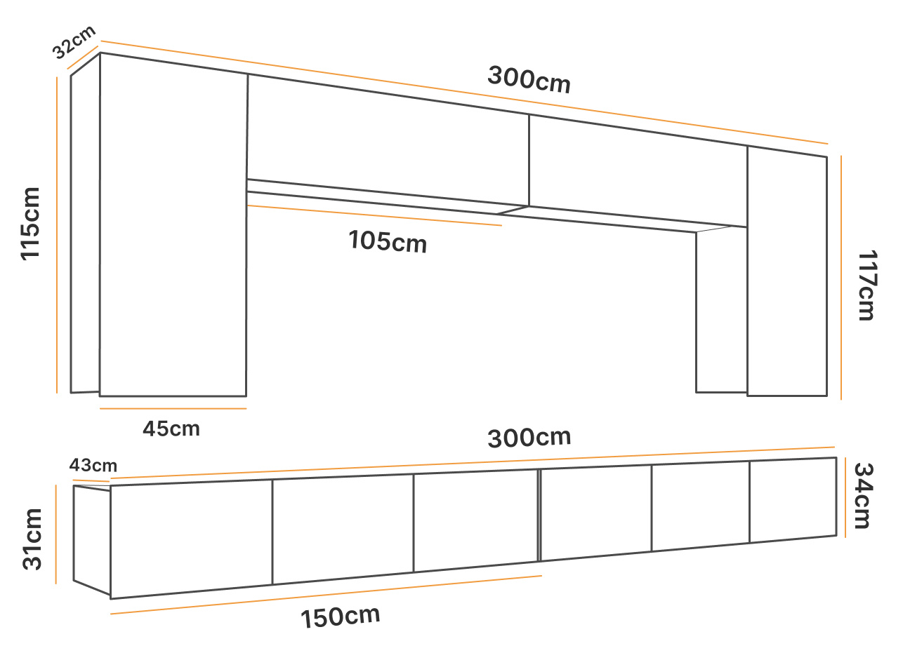 Das minimalistische Design ohne Griffe unterstreicht den modernen Charakter der Wohnwand – die über den Korpus hinausragenden Fronten erleichtern das Öffnen der Schränke und erhöhen so deren Funktionalität. Darüber hinaus können die TV-Schränke dank der mitgelieferten Füße sowohl als Hängemöbel als auch als Standmöbel montiert werden, was eine flexible Anpassung an individuelle Bedürfnisse ermöglicht.