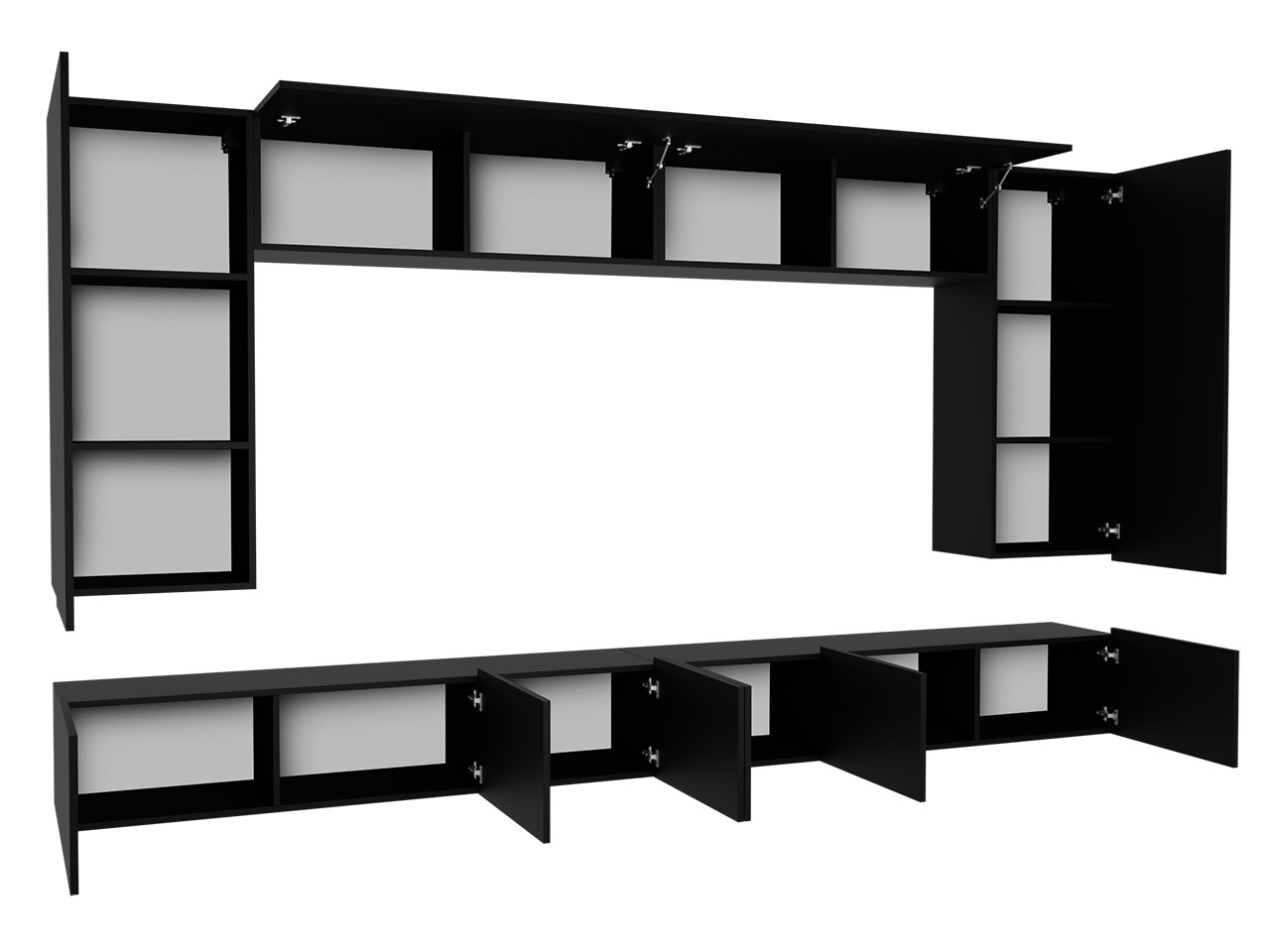 Die Wohnwand Montreal VII, die schwarze Oberschränke mit weißen Unterschränken kombiniert, ist die perfekte Wahl für alle, die ihrem Interieur einen modernen Stil mit einem Hauch von Kontrast verleihen möchten. Der matt lackierte Korpus in Kombination mit den glänzenden Fronten bildet eine elegante und harmonische Komposition, die alle Blicke auf sich zieht und jedem Raum Charakter verleiht.