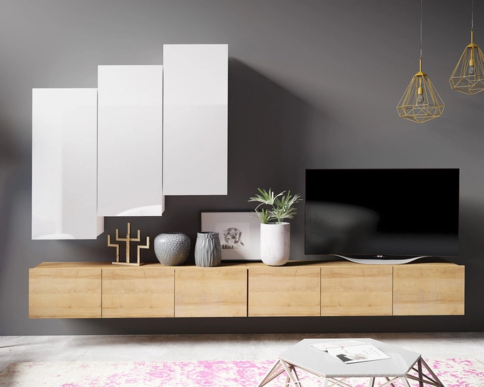 - Die TV-Möbel können als Hängemöbel oder Standmöbel montiert werden (Füße im Lieferumfang enthalten),