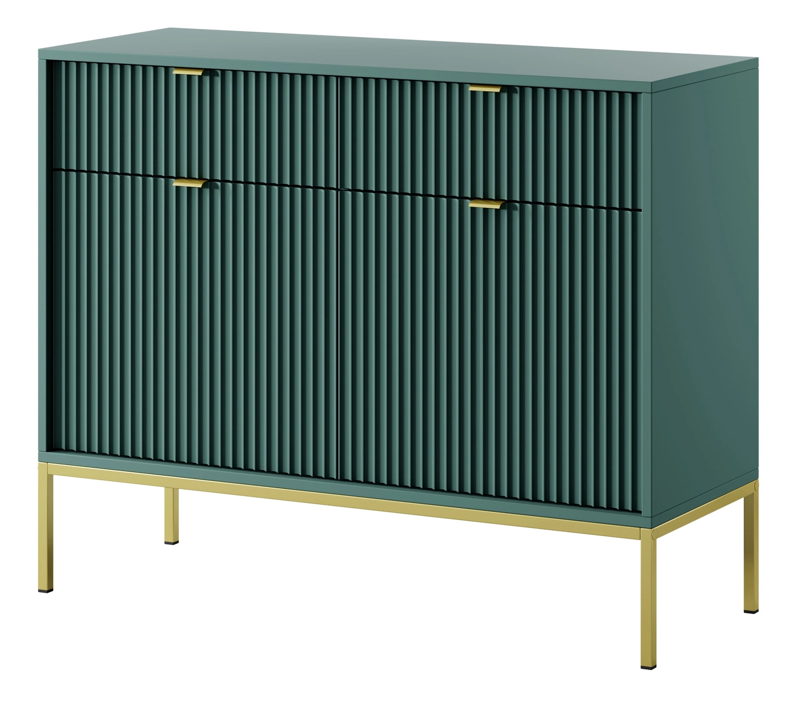 - Die 104 cm breite Kommode Kioto in stilvollem Grün ist ein einzigartiges Möbelstück, das Ihr Interieur revolutionieren wird. Diese Standkommode ist mit zwei Türen und zwei Schubladen ausgestattet.