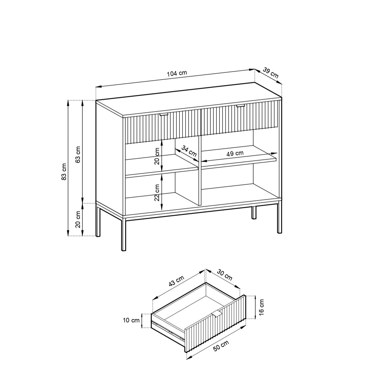 Stabile Metallbeine garantieren Stabilität und Langlebigkeit und bilden eine Komposition mit dem minimalistischen Stil der Kommode. Dieses Möbelstück passt perfekt zu den Trends des modernen Designs und macht Ihr Interieur zu einem Ort voller Funktionalität und Klasse.