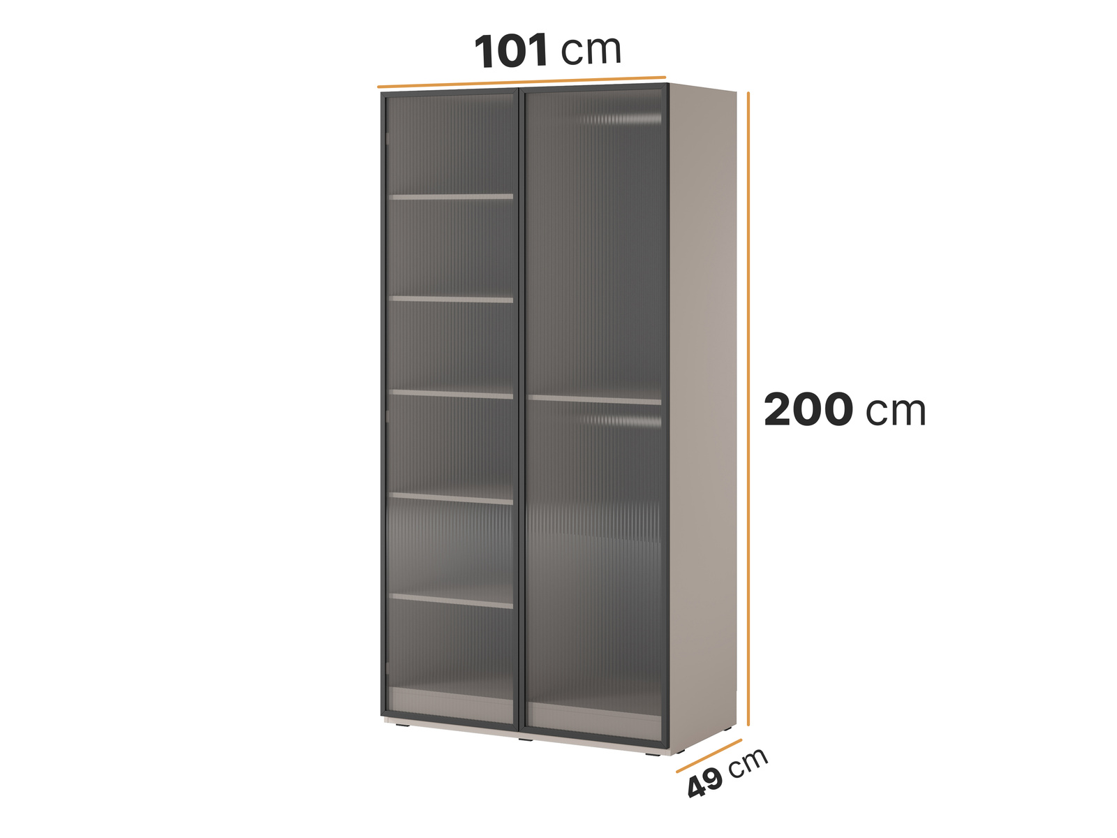Der moderne, 101 cm breite Modulgarderobenschrank ist ein Angebot für alle, die Eleganz und Funktionalität schätzen. Der Korpus in Kaschmirfarbe harmoniert perfekt mit den aufklappbaren Fronten aus geriffeltem Glas in graphitfarbenen Rahmen – ein Detail, das ins Auge fällt und dem Raum Leichtigkeit verleiht.